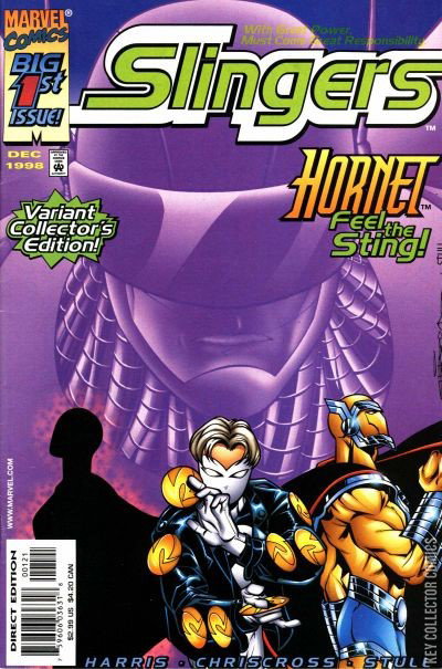 "So Whose Idea Was This Anyway?" The first issue proper of the series comes in four variants, detailing certain events from the four characters' perspectives. While around half of the story is the same in each version, there are two segments unique to each character/variant.Dusk's body is discovered by both the police and Spider-Man, the latter of whom is disturbed to find a young woman dead and in the guise of an identity he once assumed. He resolves to investigate the girl's death, and the source of the Slinger's costumes.Ricochet and Hornet talk over the phone both clearly shaken by Dusk's death. The story then spilts as each of the characters handle a local threat , converges again as the boys meet to discuss Dusk's death, then diverges again as they attempt to stop a train crash engineered by a sick, suicidal railroad worker, each issue depicting the rescue attempt from that character's perspective, with exception of Dusk who arrives too late to aid in averting the disaster, but manages to save a young boy in the aftermath.The common part of the issues begins again as Prodigy visits the Slinger's mentor, the golden age hero, the Black Marvel.