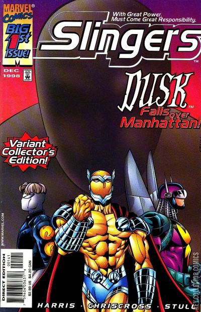 "So Whose Idea Was This Anyway?" The first issue proper of the series comes in four variants, detailing certain events from the four characters' perspectives. While around half of the story is the same in each version, there are two segments unique to each character/variant.Dusk's body is discovered by both the police and Spider-Man, the latter of whom is disturbed to find a young woman dead and in the guise of an identity he once assumed. He resolves to investigate the girl's death, and the source of the Slinger's costumes.Ricochet and Hornet talk over the phone both clearly shaken by Dusk's death. The story then spilts as each of the characters handle a local threat , converges again as the boys meet to discuss Dusk's death, then diverges again as they attempt to stop a train crash engineered by a sick, suicidal railroad worker, each issue depicting the rescue attempt from that character's perspective, with exception of Dusk who arrives too late to aid in averting the disaster, but manages to save a young boy in the aftermath.The common part of the issues begins again as Prodigy visits the Slinger's mentor, the golden age hero, the Black Marvel.