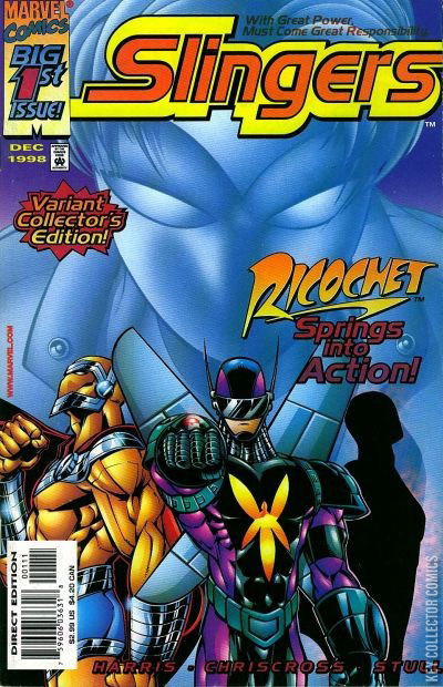"So Whose Idea Was This Anyway?" The first issue proper of the series comes in four variants, detailing certain events from the four characters' perspectives. While around half of the story is the same in each version, there are two segments unique to each character/variant.Dusk's body is discovered by both the police and Spider-Man, the latter of whom is disturbed to find a young woman dead and in the guise of an identity he once assumed. He resolves to investigate the girl's death, and the source of the Slinger's costumes.Ricochet and Hornet talk over the phone both clearly shaken by Dusk's death. The story then spilts as each of the characters handle a local threat , converges again as the boys meet to discuss Dusk's death, then diverges again as they attempt to stop a train crash engineered by a sick, suicidal railroad worker, each issue depicting the rescue attempt from that character's perspective, with exception of Dusk who arrives too late to aid in averting the disaster, but manages to save a young boy in the aftermath.The common part of the issues begins again as Prodigy visits the Slinger's mentor, the golden age hero, the Black Marvel.