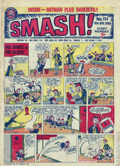 Home / IPC Magazines / Smash! / Smash! #114 IPC Magazines Released April 1968 Smash! #114 Add to Collection Want It Synopsis No synopsis available. Issue 74 of 173 Add to Collection Buy it on eBay Buy on eBay Low $5 Mid $15 High $50 Synopsis No synopsis available. Details Series Smash! Cover Date April 1968 Pages 28 UPC N/A Cover Price N/A Final Order Cutoff N/A Creators No creators listed. Price Guide Log in or subscribe to access detailed graded price information and market insights. Log In Subscribe