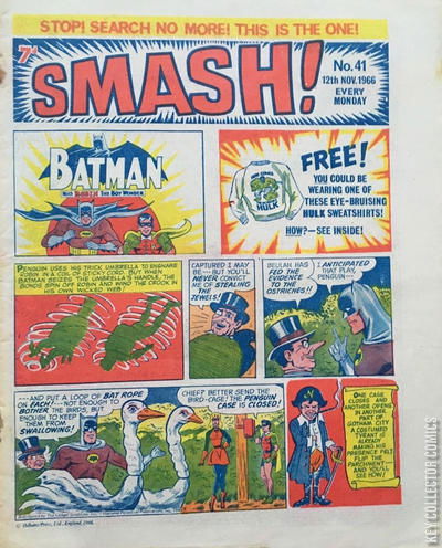 Home / IPC Magazines / Smash! / Smash! #41 IPC Magazines Released November 1966 Smash! #41 Add to Collection Want It Synopsis No synopsis available. Issue 29 of 173 Add to Collection Buy it on eBay Buy on eBay Low $5 Mid $15 High $50 Synopsis No synopsis available. Details Series Smash! Cover Date November 1966 Pages 28 UPC N/A Cover Price N/A Final Order Cutoff N/A Creators Cover Artist Sheldon Moldoff Price Guide Log in or subscribe to access detailed graded price information and market insights. Log In Subscribe
