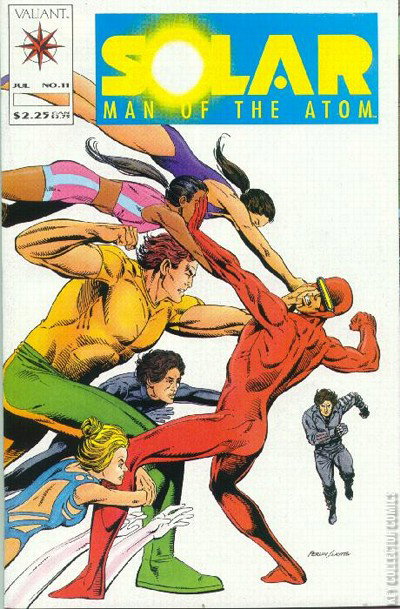 Trapped by a force-field, Solar is under attack by the Eggbreakers! But Geoff no longer feels that Solar is the "Sun Demon" he fears will destroy the world. So, as Solar strives not to hurt the misguided Eggbreakers, Gilad convinces Harada to call off the attack. Now, Solar and Geoff go to the home of Erica Pierce, only to find that she has been murdered by her superhuman counterpart from the world Solar destroyed!1st appearance:- Jolt- Quell- Sponge- Albert Pierce (1st full appearance)