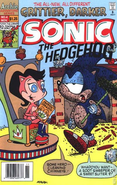 Sonic the Hedgehog #4 is the fourth issue of the Sonic the Hedgehog comic series. It was released in November 1993. This comic features two stories: "The Lizard of Odd!" and "Tails' Little Tale". It also features five featurettes: "Antoine's Vain Refrain", "Robotnik Birthday Card", "HorizontAL & VertiCAL", "Bad-Niks Bazaar" and "Hare Styling". The first story to feature Super Sonic! Robotnik has decided to roboticise the ultimate creature - but due to Swatbot incompetence all he gets is a salamander. But thanks to a Buzzbomber that pulls the wrong switch it grows out of control becoming The Universalamander! But this robot isn't under Robotnik's control, and acting as a free agent he proceeds to destroy everything in site!