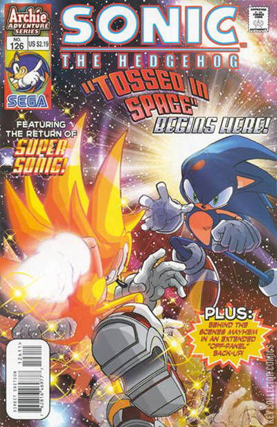 "Tossed in Space, Part 1: Red Chaos" and "Tossed in Space, Part 2: Hog & Superhog" After last issue's pulse-pounding events, Sonic finds himself on a strange planet on the other side of the universe. While seeking a way home is his initial priority, his heroic instincts soon take over as he helps defend an alien race from their aggressors. By issue's end, Sonic will be forced to fight the last person he ever expected to face! You'll have to read it to believe it! Better Read Than Dead The Off-Panel strip graduates from the letters page to become its own five-page story. Read in awe as Sonic and The Editor face the evil of... Deadline! Can they get the issue done on time before Sonic is erased from existence?