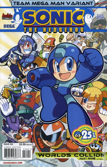 Celebrate 250 issues of the longest-running video game based comic series, Sonic the Hedgehog, with 'When Worlds Collide' Part Nine of Twelve! The final act of the crossover mega-event starts here as Sonic and Mega Man stand united against the Wily Egg - and backing them up are all their heroic friends. Standing against them are the Robot Masters-all of them! Let the battle begin! At a whopping 48 pages, this double-sized issue features a special, digitally remastered re-presentation of the first Sonic the Hedgehog issue! Also featuring a stunning new wrap-around cover by Patrick 'SPAZ' Spaziante. Plus, choose your favorite hero with the 'Team Sonic' and 'Team Mega Man' CHIBI variant covers! Continued in this month's Mega Man #27!