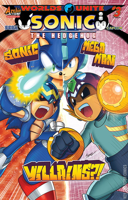 'Sonic/Mega Man: Worlds Unite,' Part 3. It's a cascade of cross-dimensional chaos! On Sonic's World, the Freedom Fighters are battling with the terrifying arsenal of M'egga Man! On Mega Man's World, the Robot Masters can't keep up with the super speedy Sonic Man! Who can possibly save our heroes? The answer is sure to surprise you! Featuring cover art from the legendary Patrick 'SPAZ' Spaziante, villain variant by T.Rex and part 3 of the epic 12-part connecting variant cover series by artist Ben Bates!