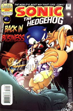 Sonic the Hedgehog #73 is the seventy-third issue of the Sonic the Hedgehog comic series. It features two stories: "The Truth is Out There..." and "Tales Of the Great War - Part II - The Big Bad One". The madman himself may be gone, but his evil lives on. We're speaking of course of Robotnik's satellites, which link to each other while in orbit, forming a mega-sized space base. Meanwhile, back on Mobius, Sonic's parents are about to celebrate their wedding anniversary - complete with new wedding bands fashioned from power rings. The celebration is cut short by the threat of the space base, and Sonic and the Freedom Fighters reunite in secret to investigate the mysterious satellites and who might be behind it all, and are spaceward bound to investigate. That is, if they can get off the ground - for just as they are about to leave, they receive a distress signal from Sonic's parents urging them to return at once. What diabolical menace has befallen our heroes now? You have three guesses- and the first two don't count!