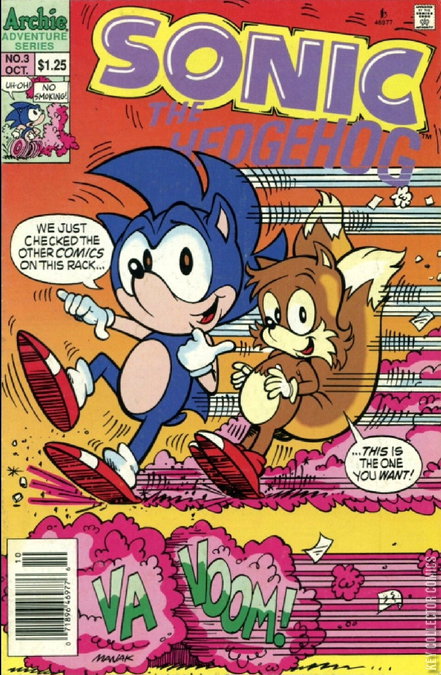 Sonic the Hedgehog #3 is the third issue of the Sonic the Hedgehog comic series. It was released in October 1993. Here, we see Bunnie Rabbot for the first time. This comic features two stories: "The Bomb Bugs Me!" and "Rabbot Deployment". It also features four featurettes: "Tails' Fairy Tales", "Double Speak", "Paper Trail" and "Robotnik Rules". Sonic comes to inform Sally and Boomer that Robotnik has access to "The Bomb"... To trick Robotnik, they project a picket line on a wall outside his office as Boomer disguises himself as Robotnik to trick Crabmeat into giving "The Bomb" to the freedom fighters, but this plan backfires when Robotnik shows up dressed in a Boomer suit! Think that's crazy? Just wait till you find out what "The Bomb" is!
