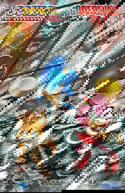 It’s a crossover of massive proportions! The Blue Blur’s battle with Dr. Eggman is upended by the arrival of two enormous monsters emerging from a humongous fissure in reality. The magnificent Mothra and the menacing Mechagodzilla carry their vicious battle into Sonic’s world, and its fate now hangs in the balance! Is Sonic, with the help of his loyal friends Amy and Tails, fast enough to halt the city’s frantic destruction? And why is Eggman so happy about this whole big mess?Wait, is that Eggman now? How can he take over a solici—From the files of me, Dr. Eggman! That petulant blue pipsqueak is making my existence absolute torture again—interrupting my crucial research on the beasts from the dimensional fissure! I simply MUST unlock the secrets of these giant monsters and use them to create something…eggtastic.
