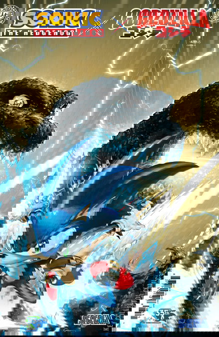 It’s a crossover of massive proportions! The Blue Blur’s battle with Dr. Eggman is upended by the arrival of two enormous monsters emerging from a humongous fissure in reality. The magnificent Mothra and the menacing Mechagodzilla carry their vicious battle into Sonic’s world, and its fate now hangs in the balance! Is Sonic, with the help of his loyal friends Amy and Tails, fast enough to halt the city’s frantic destruction? And why is Eggman so happy about this whole big mess?Wait, is that Eggman now? How can he take over a solici—From the files of me, Dr. Eggman! That petulant blue pipsqueak is making my existence absolute torture again—interrupting my crucial research on the beasts from the dimensional fissure! I simply MUST unlock the secrets of these giant monsters and use them to create something…eggtastic.