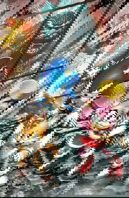 It’s a crossover of massive proportions! The Blue Blur’s battle with Dr. Eggman is upended by the arrival of two enormous monsters emerging from a humongous fissure in reality. The magnificent Mothra and the menacing Mechagodzilla carry their vicious battle into Sonic’s world, and its fate now hangs in the balance! Is Sonic, with the help of his loyal friends Amy and Tails, fast enough to halt the city’s frantic destruction? And why is Eggman so happy about this whole big mess?Wait, is that Eggman now? How can he take over a solici—From the files of me, Dr. Eggman! That petulant blue pipsqueak is making my existence absolute torture again—interrupting my crucial research on the beasts from the dimensional fissure! I simply MUST unlock the secrets of these giant monsters and use them to create something…eggtastic.