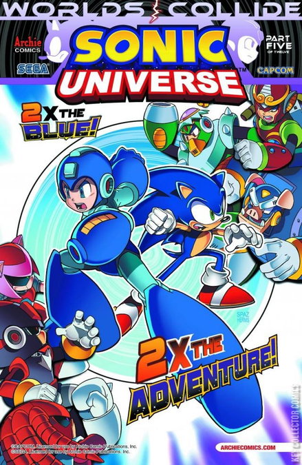 'When Worlds Collide,' Part 5 of 12. The second act of the epic Sonic the Hedgehog and Mega Man crossover event begins here! Twelve: Sonic, Mega Man, Tails, and Proto Man enter the strange world of the Skull Egg Zone. They don't receive a warm welcome, either, as the Genesis Unit and Copy Robot attack! Drs. Eggman and Wily wait in the wings with an even more sinister surprise waiting to be unleashed! You cannot miss this action-packed issue, featuring new cover art by Patrick 'SPAZ' Spaziante, and choose your favorite hero with the 'Team Sonic' and 'Team Mega Man' variant covers! Continues in this month's Sonic the Hedgehog #249.
