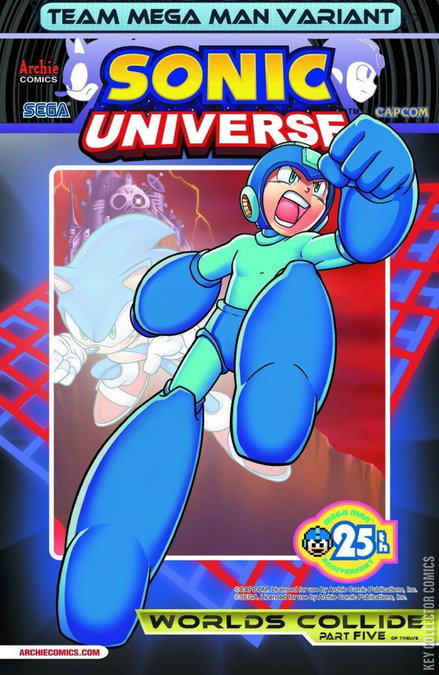 'When Worlds Collide,' Part 5 of 12. The second act of the epic Sonic the Hedgehog and Mega Man crossover event begins here! Twelve: Sonic, Mega Man, Tails, and Proto Man enter the strange world of the Skull Egg Zone. They don't receive a warm welcome, either, as the Genesis Unit and Copy Robot attack! Drs. Eggman and Wily wait in the wings with an even more sinister surprise waiting to be unleashed! You cannot miss this action-packed issue, featuring new cover art by Patrick 'SPAZ' Spaziante, and choose your favorite hero with the 'Team Sonic' and 'Team Mega Man' variant covers! Continues in this month's Sonic the Hedgehog #249.