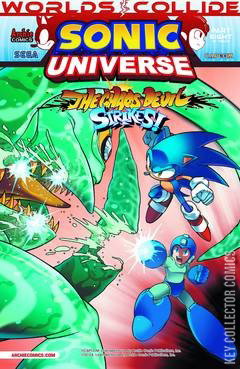 'When Worlds Collide,' Part Eight of Twelve. The hunt for the Roboticized Masters comes to its explosive end! As the gripping second act of the Sonic/Mega Man crossover event comes to a close, Proto Man and the Chaotix make a crucial discovery in the battle to restore both worlds! The tension is fraying the bromance of Drs. Eggman and Wily! Bass and Metal Sonic prepare to lead an army-but an army of what? Featuring new cover art from Sonic/Mega Man art legend Patrick Spaziante, and a special 'E.F.F. (aka Evil Friends Forever) Variant' featuring Dr.'s Eggman and Wily gaming on their EGGSbox! Continued in this month's Sonic the Hedgehog #250!