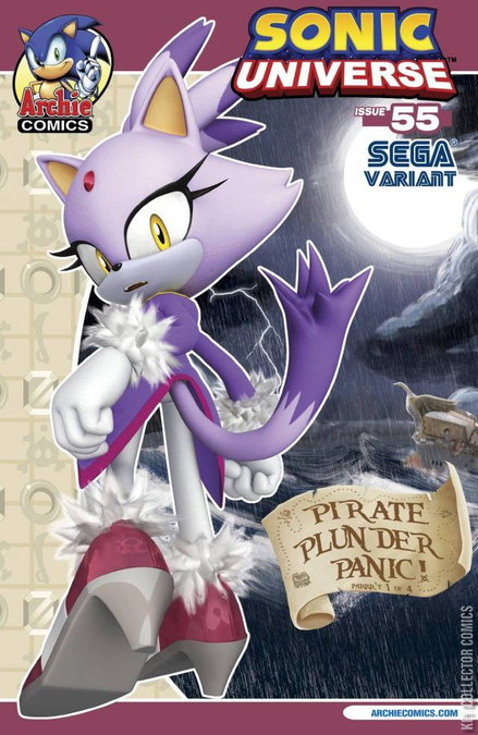 AAAAARRRR you ready?? 'Pirate Plunder Panic' Part One: It's mystery and mayhem on the high seas as Amy and Cream join first mates Blaze and Marine in their search for the final Sol Emerald! As ships clash on the stormy waters, familiar faces start to appear amongst the opposition and Blaze is targeted as enemy number 1! Who is the new, sinister force leading the robot pirates, and what is his past with Blaze? And what does a certain dynamite duck have to do with it all? Straight out of the smash-hit Sonic/Mega Man crossover event, you're going to 'treasure' this all-new storyline written and penciled by Sonic art guru, Tracy Ya'rrrrr-dley!