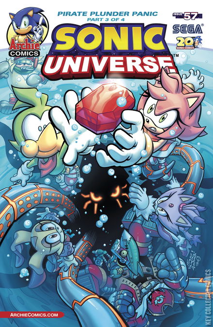 Pirate Plunder Panic Part 3: THA'RR BE MUNITY ON THE HIGH SEAS! As Capt. Metal and Capt. Whisker clash, the quest for the Sol Emeralds pits pirate agaisnt pirate even if th' be the same vessel. YO-HO! Meanwhile Blaze, Amy, Cream, and Marine are caught blazin' crossfire-and the tentacles of the terrifying sea-villian salty dog, the Kraken! You'll be walkin' if you don't read this exciting issue with new cover art from the scallywag Tracy Yardley, plus a variant cover from Sonic comic veteran arist Dawn Best!