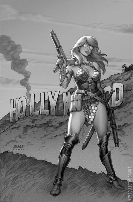 In the far-flung sci-fi future, PURPLE SONJA and her mech act as scouts for a space pilgrimage of the remaining members of humanity fleeing Earth. This scouting is made difficult by the return of Purple Sonja's greatest enemy Kaiju descending upon her. Her demise is all but assured, until she receives help from...HELL SONJA!?
