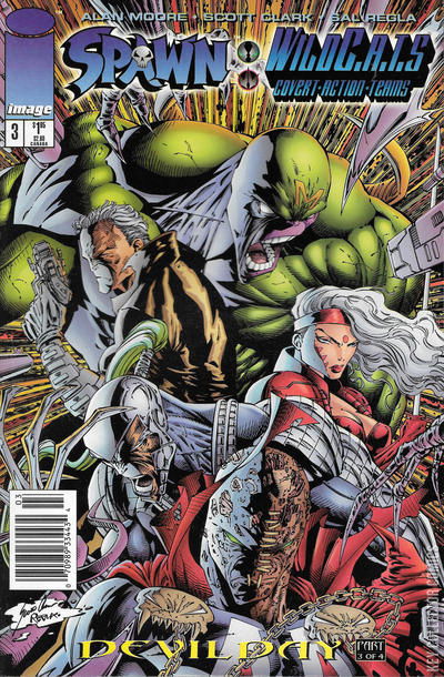"Devil Day, Part 3" Cover pencils by Scott Clark, inks by Sal Regla. Devil Day, script by Alan Moore, pencils by Scott Clark, inks by Sal Regla; Spawn (Simmons) and the WildC.A.T.s team set to wage the war against the Ipissimus in his resent enslavement of the United States of America; The Black Razor squadron along with Spawn, past and future WildC.A.T.s reflect on the fates that could be; Cameos of traitorous Gen-13 heroes Burnout and Grunge plus captive heroines lead the team to descend face to face with the future Spawn tyrant.
