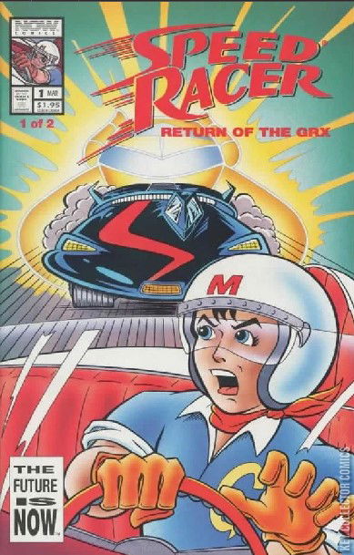 Story by Lamar Waldron. Art by George Booker. A miniseries spin-off from the Speed Racer series from Now Comics. Speed faces the return of the GRX, one of the most dangerous cars hes ever faced on the track – with an engine so fast no one has ever survived driving it. 32 pages, Full Color. Cover price $1.95.
