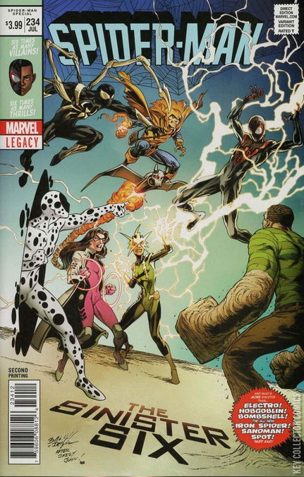 SINISTER SIX REBORN, PART 1 Miles’ world has been shaken a lot lately, but nothing will compare to what the mysterious Iron-Spider and his brand new SINISTER SIX will do. Sandman, Hobgoblin, The Spot, Electro and Bombshell (?!) join this mystery villain to make Miles’ life a living hell. PLUS: Includes 3 bonus MARVEL PRIMER PAGES! 1st appearance of Iron Spider, the uncle of Miles Morales, previously thought to be dead 1st team appearance of the Sinister Six led by Iron Spider: Sandman, Bombshell, Spot, Electro, Hobgoblin