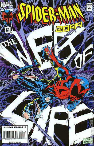 HOSTILE TAKEOVER Miguel has just been handed a platter of reality casserole - and it's not going down well! Tyler Stone is his daddy?! He was never really addicted to Rapture...and therefore, he never had to experiment on himself and become Spider-Man, if he had only waited a few days?! Ay carumba! Are all silver anniversaries so nauseating?This issue features the thrilling return of ...Young Miguel O'Hara!PlotKasey Nash, a.k.a. "Payback", lays unconscious at Alchemax. Tyler Stone enters and orders his men to remove her armor and get her out. It seems he took Conchata's threat seriously.Elsewhere, Spidey has nightmares that don't evaporate upon awakening. What had just been revealed to him - that his true father is his greatest enemy Tyler Stone - has rattled Miguel to the core. With a case of the old "Parker Luck", it begins to rain on him as he webslings away.Angela Daskalakis and her friend Miss Pivot (a woman in a highly advanced form of a wheelchair) are concerned of a hostile raid from Alchemax. The two of them discuss "Subject 394", a genetically manipulated individual who's become overly aggressive. His name: Sergeant Estevez! (See Spider-Man 2099 #8 for Angela's first meeting with Sarge)Back at Miguel's apartment, he is greeted by the newly repaired Lyla. She apologizes for trying to kill him. Miguel requests Lyla to place an untraceable call to Stark-Fujikawa's CEO from Spider-Man.At Gabe's home, his mother assures her guilt-ridden son that everything will work out with Kasey. Flyboys swoop down and leave Kasey, tattered and beaten, at his door.Miguels' call to Hikaru was insightful but difficult. Spidey questions the CEO why he manipulated Kasey. Apparently, it was all to balance the scales between Hikaru and Spider-Man. To fully repair the damage caused by Spider-Man's interference with the Specialist, he attacked someone important to him - Kasey - but pushing her out into the public untrained, certain for disaster. Spidey's threats are matched, and he is ordered never to...