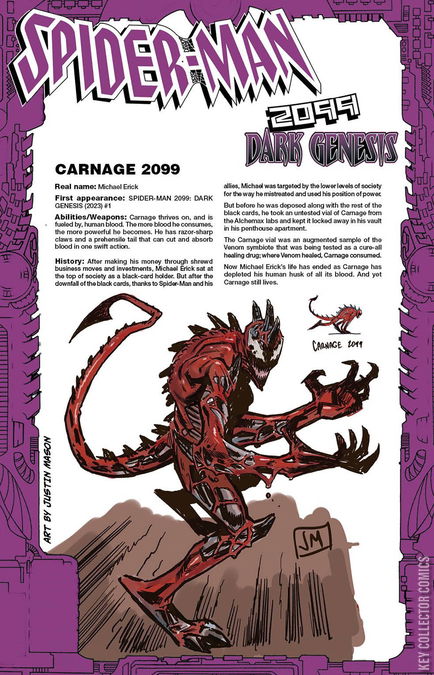 FROM THE SHADOW OF EXODUS... COMES THE DARK GENESIS! MIGUEL O'HARA, THE FUTURISTIC SPIDER-MAN OF 2099, MUST FACE A SINISTER CARNAGE LIKE NEVER BEFORE! As society begins to crumble, SPIDER-MAN 2099 will need all the help he can get - but does the public even want his help? Or do they all just want to watch this world burn? STEVE ORLANDO (SCARLET WITCH, SPIDER-MAN 2099: EXODUS) continues his journey through the future world of 2099, this time paired with bombastic artist JUSTIN MASON (SPIDER-PUNK) - get ready for the debut of the NEW HEROES and VILLAINS that populate the future! Rated T+