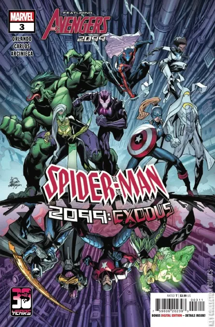 EXODUS, PART III FEATURING THE NEW AVENGERS OF 2099! 2099’s MASTERS OF EVIL once killed the AVENGERS as a statement of their might. Now they return from the stars to reap the Celestial Garden’s wealth. But one Avenger survived: MOON KNIGHT, who has gathered a new team of heroes! Can SPIDER-MAN and these NEW AVENGERS repel the Masters of Evil and save 2099’s new Eden?