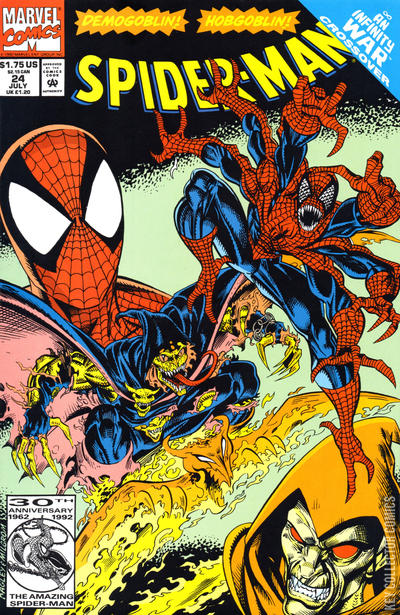 DOUBLE INFINITY Peter Parker awakens from nightmares about some of his foes including Demogoblin, Hobgoblin, the Green Goblin, and Venom. Unable to got back to sleep, Peter decides to go out web-slinging in order to clear his head. Before leaving, he leaves a note for his wife Mary Jane telling her where he went so she doesn't worry. As Peter changes into his Spider-Man costume he wonders if he's Peter Parker or his alter-ego, considering how often his costumed identity has creeped into his personal life. As he swing across the city, Spider-Man spots a mugger about to attack someone from behind and snatches them off the street before they can accomplish this. As the hero swings onward, he is unaware that something is lurking in the shadows watching him. Elsewhere in the city, Jason Macendale also tosses and turns in his sleep. He is haunted by the memory of his time possessed by a demon during his attempt to gain more power and how he was recently separated from the creature. Waking up, Jason begins training his skills to get it off his mind. He ultimately puts on his Hobgoblin costume and heads out looking for the Demogoblin, unaware that his would-be prey is following after him. By this time, Spider-Man is swinging through Times Square, considering the idea that hanging up his costume since most of his foes only exist because their vendetta against Spider-Man. Suddenly, Spider-Man's spider-sense goes off and he narrowly dodges the body of the Hobgoblin. It has been hurled into one of the digital signs over Times Square by the Demogoblin, who has come to punish his former host for his past sins. In order to protect the innocent bystanders down on the street, Spider-Man tries to shut down the fight before someone gets hurt. Suddenly, the streets begin to become misty and Spider-Man is ambushed by a creature that looks like a warped version of himself. It is wearing what looks like a Spider-Man costume, but it has segmented eyes, razor sharp teeth, and six arms. As Spider-Man struggles to get the creature off of him, the Hobgoblin recovers his glider and tries to escape. As soon as Hobgoblin tries to get away, he is pursued by the Demogoblin who begins tossing burning razor bats and pumpkin bombs in an attempt to destroy Macendale. At that moment, Spider-Man tosses his evil doppelganger off of a rooftop. Unfortunately, it survives the fall and climbs back up after Spider-Man. Deciding he has to stop this fight immediately, Spider-Man knocks Demogoblin to the ground with a single kick. When the Hobgoblin tries to flee, Spider-Man attaches a web-line to his glider in the hopes of taking him down as well. That's when the Spider-Doppleganger begins firing web-lines at them. The creature's webbing is razor sharp and cuts through Spider-Man's web-line and slices open the Hobgoblin's shoulder. Both men fall into a nearby alley where they are penned in by their attackers. Fed up of his demonic double coming after him, Hobgoblin pulls out a ray gun and begins blasting him while Spider-Man deals with his evil twin. By the time Spider-Man knocks out his double, Demogoblin has fled, leaving the wall-crawler under the barrel of the Hobgoblin's gun. However, as the villain pulls the trigger, the Spider-Doppleganger leaps at the hero. Spider-Man's spider-sense allows him to duck in time, leaving the evil twin to take the shot meant to for the hero. The blast sends the doppleganger flying backward, impaling itself on a fencepost. In the confusion, the Hobgoblin manages to escape. Thinking his evil twin is dead, Spider-Man decides to go to the Four Freedoms Plaza to see what Reed Richards of the Fantastic Four can make of this strange encounter. After Spider-Man leaves, Demogoblin returns to the scene. Deciding that the Spider-Doppleganger can be a useful tool in his war against evil, the demon infuses it with some of his magic and carries the body away.