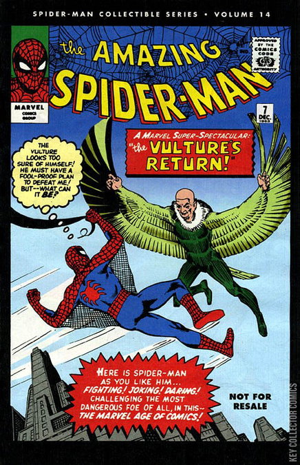 (Part 1) After being sent to jail in Issue #2, the Vulture has been a model prisoner. He has been allowed to use the machine shop in the prison where he has secretly been working on making a new makeshift flying harness. When it is complete, he simply flies over the prison wall while out in the exercise yard. When Peter Parker hears about the escape, he has to make an excuse to leave during volley ball practice. This causes Flash Thompson and others to give him a hard time. Peter quickly heads home to change into Spider-Man. He brings his anti-magnetic inverter that he used against the Vulture in their last encounter. Little does he realize that the Vulture has modified his wings to fly better and not be affected by the inverter. Vulture robs a jeweler and is spotted by Spider-Man. He fakes falling when Spidey uses the inverter and then gives him a sucker-punch. The punch causes Spider-Man to fall and sprain his arm. Peter now has to make excuses to his classmates and Betty as to how he sprained his arm. He tries selling pictures of the Vulture to J. Jonah Jameson when the Vulture arrives to steal the Bugle's payroll. As Jameson does his best to talk the Vulture out of stealing from him, Peter ducks out to change into Spider-Man. Spider-Man arrives as Jameson and the Vulture are still arguing. Spider-Man and the Vulture begin fighting in the office and make a mess much to Jameson's chagrin. With his arm still hurting, he lets the Vulture carry him high in the air. Spider-Man then webs the Vulture's wings so that he is unable to fly. As they begin falling, the Vulture begs Spider-Man to save them. At the last moment, Spidey makes a web parachute that allows them to safely glid down to the police waiting below. Spider-Man returns to the Bugle and finds that Jameson holds him responsible for the mess and damage in the office. Annoyed, Spider-Man webs Jameson's mouth shut and leaves. Peter and Betty are then allowed to enjoy a peaceful afternoon as Jameson huffs around the office in silence, waiting for the webbing to dissolve.