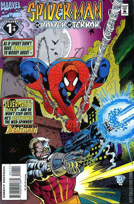All this happens while Peter's marriage to MJ is having ups and downs. He has learned that his "Parents" were in fact robots. He's been through his dark and moody "I am the Spider" thing. He's met Ben, and Judas Traveller, and learned that he's gonna be a dad.Now, in the meantime, he's swinging around looking for trouble. He finds it, when he runs into a mass Maggia hit. When he turns up, the two sides start shooting him instead of each other. A few "Innocents" get caught up in the struggle, and catch too many bullets to go on living. Spidey now has a motive to get involved.Cut to Coney Island. Deathlok (Michael Collins) is being attacked in an old theme park by half of the Sinister Syndicate - Beetle, Speed Demon, Hydro-Man. They've been sent by a "Mutual Friend". They lead Deathlok on a trail to... where?Meanwhile, Caesar Cicero comes to pay his respects to Silvio Manfredi - Silvermane. Silvermane and Cicero have battled for control of his Maggia family for many years. But now Silvermane has new plans. Seems like he wants to form an alliegance of Maggia families for some reason. He also has "taken steps" to improve his personal condition, i.e. the fact that he is basically a head living in a machine. Also, he has created Scorpia, based on the Scorpion's outfit... ignoring the fact that the Scorpion actually has significant physical enhancements too, and is far more than just a costume.Seems Cicero has agreed to ally with Silvermane, and cooks up a plan to block all the tunnels and blow up the bridges in and out of New York. It's all about Power, ya see, the Power of Terror!