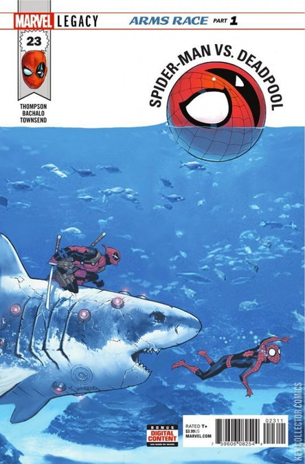 ARMS RACE, PART 1 When Spider-Man learns that Deadpool is selling S.H.I.E.L.D. technology on the black market it's the last straw. Bromance? Over! It's time to hunt Deadpool! The two biggest characters in comics are facing off and it's going to take them all over the Marvel Universe, no holds barred. As you can see from this cover, Deadpool's even willing to use his laser-sharks. And it will all lead to the biggest Spider-Man/Deadpool story of all time! PLUS: Includes 3 bonus Marvel Primer Pages!