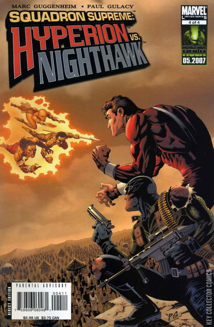 It all comes down to this: The final confrontation between Hyperion and Nighthawk! Will their conflict destroy an entire COUNTRY -- or save it? All of the mysteries are answered here and Marc (Wolverine, Blade) Guggenheim and Paul (Shang-Chi) Gulacy have them!!