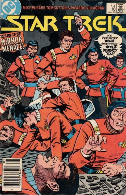 Kirk and crew's counterparts from the mirror universe pierce the dimensional veil in search of conquest in "Double Image". Part 2 of 7, continued from the previous issue. Story continues next issue. Spock, Sarek cameos. U.S.S. Courageous, U.S.S. Excelsior take heavy damage.