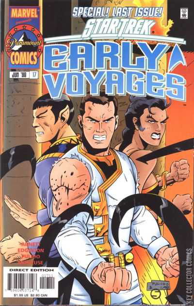This issue ends with more huge cliffhangers and never finishes them as this is the last issue of the series. In the Story Captain Christopher Pike is shown up by Kaaj on the planet's surface and had his shuttle craft badly damaged with Spock, Phillip Boyce and Virka. Number One is injured on the bridge with many others when her head it hit in a fall from a blast. The whole crew is surrounded by Klingon ships and the first Captain of the Enterprise ever Robert April is in command. The End.