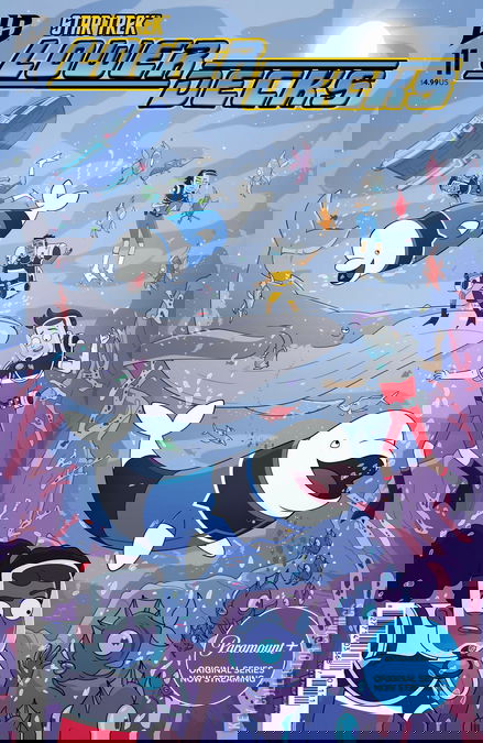Sqeak, squaw, sssskkkaaa, eh, eee.[Translation: Cetacean Ops here! Matt and I have brought the crew of the U.S.S. Cerritos back to the year 1987 for a top-secret mission of great import.]HHHkkkeeeeee, ska, ska, EeeEEAaa. Squaw, squaw. *Click, cliiiiick*[Translation: That’s right, Kimolu. We need their help to fix what that blowhole Kirk messed up by bringing the whales George, Gracie, and Ronald to Earth without a way for them to repopulate its oceans. What was Ronald supposed to do, have babies with his mother?]Skkkesaw. Eehhh, ee, ee, AaaaaAa. AH, AH, EeeEE! Sqqqqaw.[Translation: But the remaining humpbacks have all heard freaky conspiracy theories about what happened to the last pod who went to Earth. To save the species, the Lower Deckers will have to dissuade them of the rumors and convince them Earth is worth inhabiting. Ah-yikes.]This issue kicks off the penultimate arc of this season’s run, so be sure to order whale ahead of time!