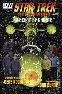 John Byrne continues his new Star Trek photoplay adventures with "A Scent of Ghosts" and "Memoriam." Past and Present collide, as the Enterprise takes aboard a special figure from Spock's past, only to find themselves haunted by an mystery from years before. Plus, a sad farewell.