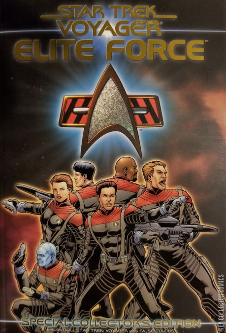 Prestige format comic packaged with Star Trek: Voyager Elite Force Collector's Edition game from Activision. Cover combines matte and glossy artwork with gold foil lettering. Slightly smaller than regular comic book size, 6.125 in X 9 in. Also contains Star Trek: Voyager - False Colors.