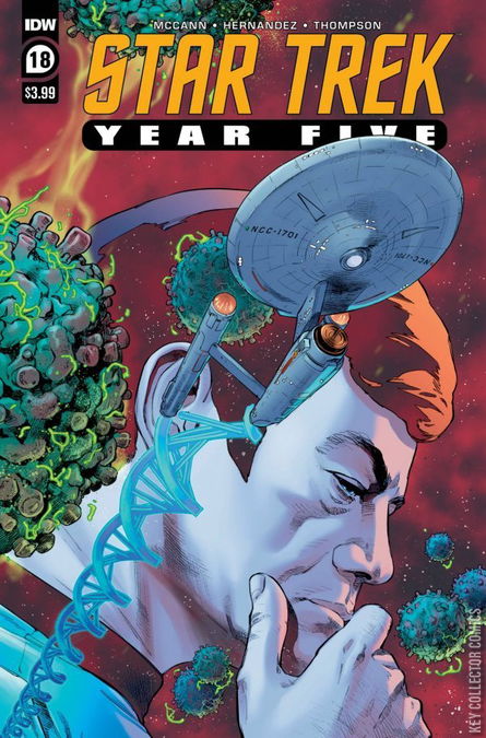 The Enterprise receives a distress call from Alpha Centauri and arrives to find a planet in the midst of a deadly global pandemic. But is nature responsible for this new virus, or is there something more sinister at play? The final voyages of the U.S.S. Enterprise continue in this new episode from Eisner-winning writer Jim McCann (Return of the Dapper Men) and superstar artist Angel Hernandez (Star Trek: Picard) .