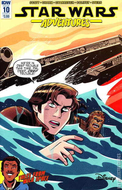 'Powered Down,' Part 1 (of 2). Han and Chewie are on the run from bounty hunters and take refuge on a planet that mysteriously shuts downs all electronics. With no way off the planet, will our favorite scruffy duo be able to evade their pursuers? Also features a Lando Calrissian story by Elsa Charretier and Pierrick Colinet! Continues the story set up in the Star Wars Adventures Free Comic Book Day issue!
