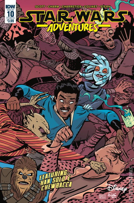 'Powered Down,' Part 1 (of 2). Han and Chewie are on the run from bounty hunters and take refuge on a planet that mysteriously shuts downs all electronics. With no way off the planet, will our favorite scruffy duo be able to evade their pursuers? Also features a Lando Calrissian story by Elsa Charretier and Pierrick Colinet! Continues the story set up in the Star Wars Adventures Free Comic Book Day issue!
