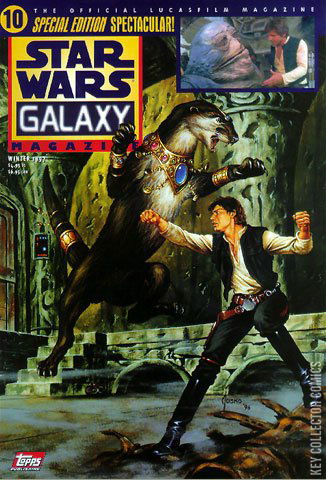 Star Wars Galaxy Magazine 10 is the tenth issue of Star Wars Galaxy Magazine. It was published by Topps in January 1997. This issue's theme focused on the then-upcoming Star Wars Trilogy Special Edition. The Deluxe Collectors' Edition of issue 10, exclusive to subscribers and comic stores, came polybagged with two promotional trading cards, one featuring Jabba the Hutt for Topps' Star Wars Trilogy Special Edition Widevision set and another highlighting issue 10's cover art by Joe Jusko. This issue also included the fold-out poster article What's New in the Trilogy.