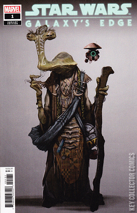 PART I: BAITING THE HOOK A CALL TO ADVENTURE ON THE VERY EDGE OF THE GALAXY! THE COMIC TIE-IN TO THE THEME PARK! BLACK SPIRE OUTPOST has long been frequented by smugglers, merchants and travelers from every corner of the galaxy looking to make their score on the infamous black market – or experience the exotic thrills only the remote world of Batuu has to offer. Beings like the infamous DOK-ONDAR, a proprietor of rare and one-of-a-kind antiquities, thrive on the unique opportunities which abound on the lawless outpost at the very edge of Wild Space! But the evil FIRST ORDER has come to Batuu and the survival of the entire outpost is at stake! The road to Black Spire’s possible salvation might begin in the past...with a job HAN SOLO and his partner CHEWBACCA pulled for Dok-Ondar. The newest chapter of the growing Star Wars saga begins this April with ETHAN SACKS ( OLD MAN HAWKEYE ) AND WILL SLINEY ’S ( BEN REILLY: SCARLET SPIDER , SOLO: A STAR WARS STORY ) GALAXY’S EDGE – the riveting comic adventure tie-in to the theme park.