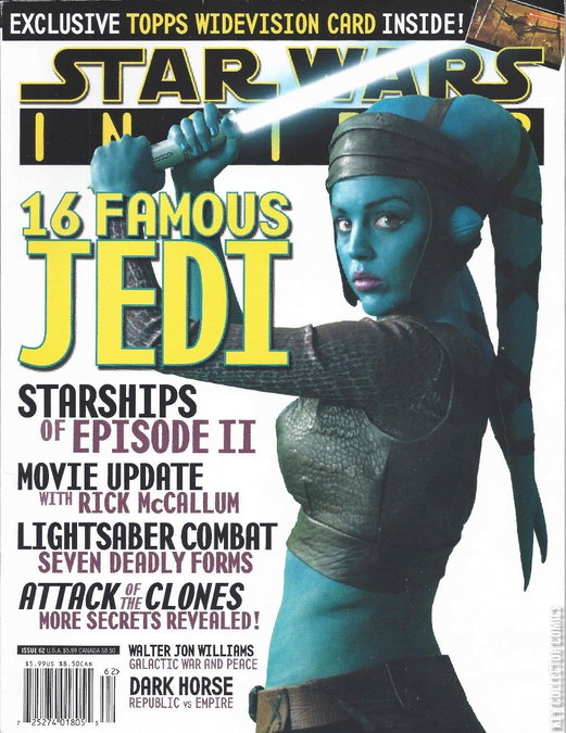 Star Wars Insider 62 is the sixty-second issue of Star Wars Insider magazine. It was released to newsstands in October 2002. This marked the first Star Wars Insider issue published by Paizo Publishing as well as the start of the magazine being released eight times a year, an increase from Star Wars Insider's former bimonthly publication schedule, which began with issue 35 in September 1997. Issue 62 came packaged with an exclusive Topps Attack of the Clones Widevision card.