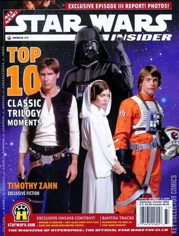 Star Wars Insider 77 is the seventy-seventh issue of Star Wars Insider magazine. It was released to newsstands on August 3, 2004. This marked the first Star Wars Insider issue published by IDG Entertainment as well as the first overseen by chief editor Brett Rector. Beginning with issue 77, Star Wars Insider implemented the fan newsletter Bantha Tracks as a regular department of the magazine, and also introduced with each new issue exclusive supplementary content online through the StarWars.com Hyperspace feature.