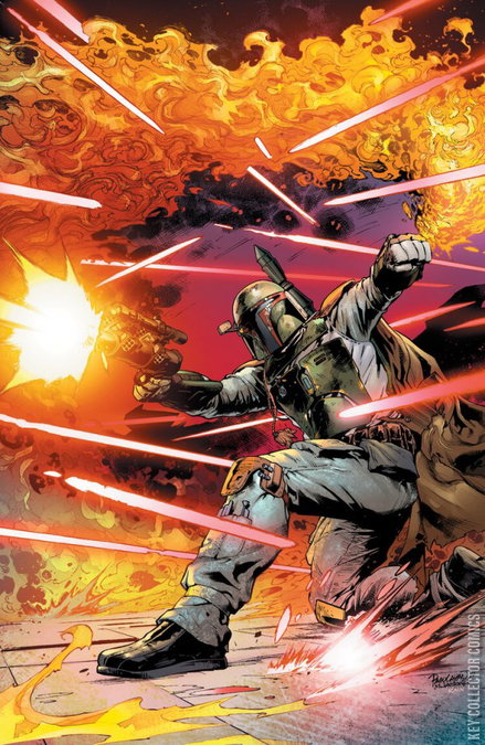 WAR OF THE BOUNTY HUNTERS, PART I: MOST WANTED AT WAR FOR THE GREATEST PRIZE OF ALL: HAN SOLO! THE HUNT BEGINS! Nobody. Steals. From BOBA FETT! The notorious bounty hunter will not stop until he gets whats rightfully his. For the thief, no corner of the galaxy is safe. Good thing for them that the REBEL ALLIANCE, THE EMPIRE and every bounty hunter in the galaxy is standing in Bobas way. With a last-page reveal that will blow this Death Star-sized story wide open, Issue #1 is just the beginning. The biggest crossover in STAR WARS history will continue raging through the pages of the WAR OF THE BOUNTY HUNTERS event miniseries and tie-in to STAR WARS, DOCTOR APHRA, DARTH VADER and BOUNTY HUNTERS through October. Only one hunter will be left standing, and the STAR WARS galaxy will never be the same! this virgin variant is limited to 501 copies