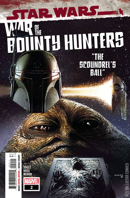 WAR OF THE BOUNTY HUNTERS, PART II: THE SCOUNDREL'S BALL THE BIGGEST COMIC EVENT OF THE STAR WARS GALAXY CONTINUES! Notorious bounty hunter BOBA FETT has tracked his missing prize—heroic smuggler HAN SOLO, frozen in carbonite—to the remote, frozen world of JEKARA. But representatives from many of the galaxy’s most powerful factions have gathered, and they all want the same thing—Solo. Things go from bad to worse, as Boba Fett realizes that he himself has become almost as valuable to the galaxy’s hunters as Han Solo, and he must turn to the least trustworthy person in the galaxy for help... DOCTOR APHRA…
