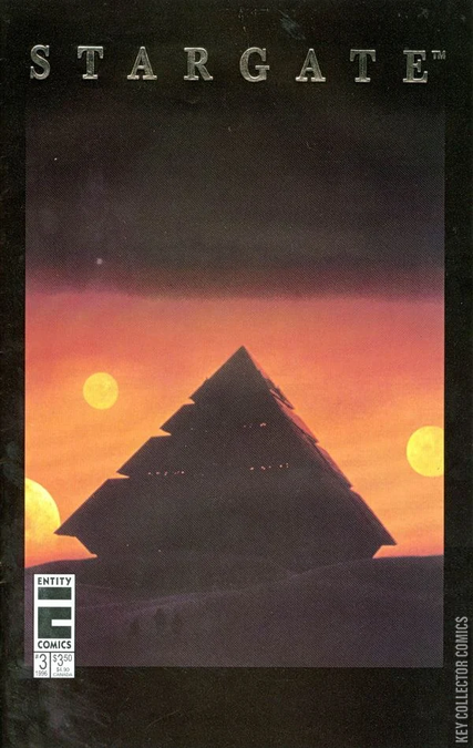 Silver foil title Special Edition cover. Story by Barry Blair and Colin Chan. Art by Delfin Barral. The official comics adaptation of the original film that spawned the Stargate sci-fi franchise. Colonel Jack ONeill and scientist Daniel Jackson get caught up in an interstellar war after an ancient portal is unearthed in Egypt. Ra captures the Earth forces, and Jackson pays the ultimate price; ONeill makes a desperate gamble to save the inhabitants of Abydos. Includes a two-page photo gallery featuring color stills from the film starring Kurt Russell and James Spader. 28 pages, Full Color. Cover price $3.50.