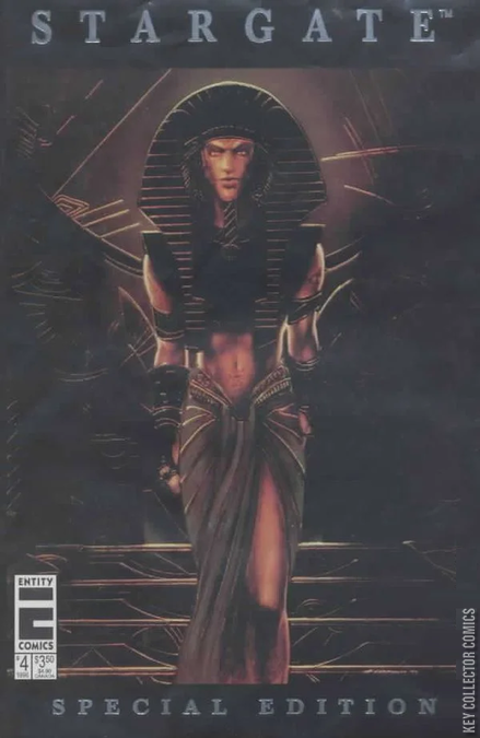 Silver foil title Special Edition cover. Story by Barry Blair. Art by Delfin Barral. The official comics adaptation of the original film that spawned the Stargate sci-fi franchise. Colonel Jack ONeill and scientist Daniel Jackson get caught up in an interstellar war after an ancient portal is unearthed in Egypt. Daniel tries to save Sha'uri from a lethal injury; Ra plans to send a nuclear device through the Stargate to Earth. Includes an exclusive photo gallery featuring color stills from the film starring Kurt Russell and James Spader. Final issue of the series; followed by Stargate Doomsday World. 28 pages, Full Color. Cover price $3.50.