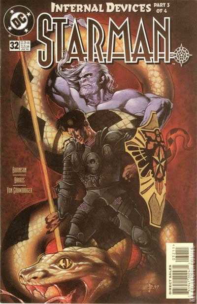 In part 3 of the 6-part "Infernal Devices," Jack Knight goes up against Copperhead! Now at the mercy of Dr. Pip and his forces, Starman is trapped with the ticking time bomb. A mysterious figure from Jack's past resurfaces, while the Black Pirate races to stop the bomb before it explodes.