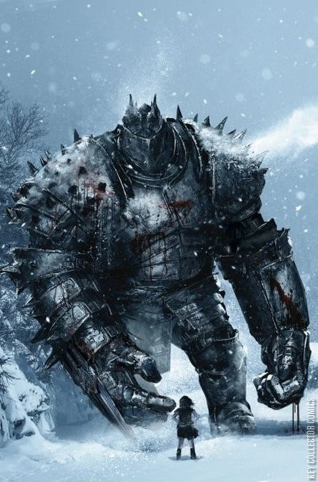 An armored giant and a helpless child. Together they cross an astonishing world brimming with beasts, bandits, and—deadliest by far—civilizations… If they stop walking, the earth itself forces them onwards. WHY? The child can’t ask. She and her guardian have no language, no memory, nothing—except each other. Multiple-Eisner nominees SI SPURRIER (X-Men), MATÍAS BERGARA (Coda), and MATHEUS LOPES (Supergirl) present a watershed moment in modern comics: four double-length chapters of a bittersweet fantasy opus, completely text free. Let’s take a walk.